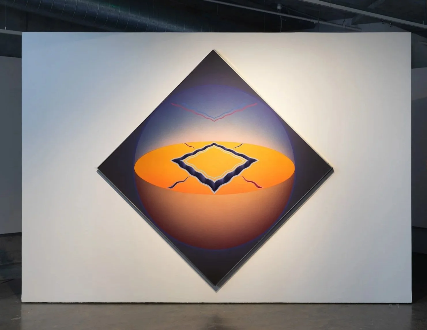 In the centre of the artwork, a large circle of two muted colours appears to be touching to the edges of the painting. Between the outer circle and the corners of the diamond, the colour of the background is dark grey.