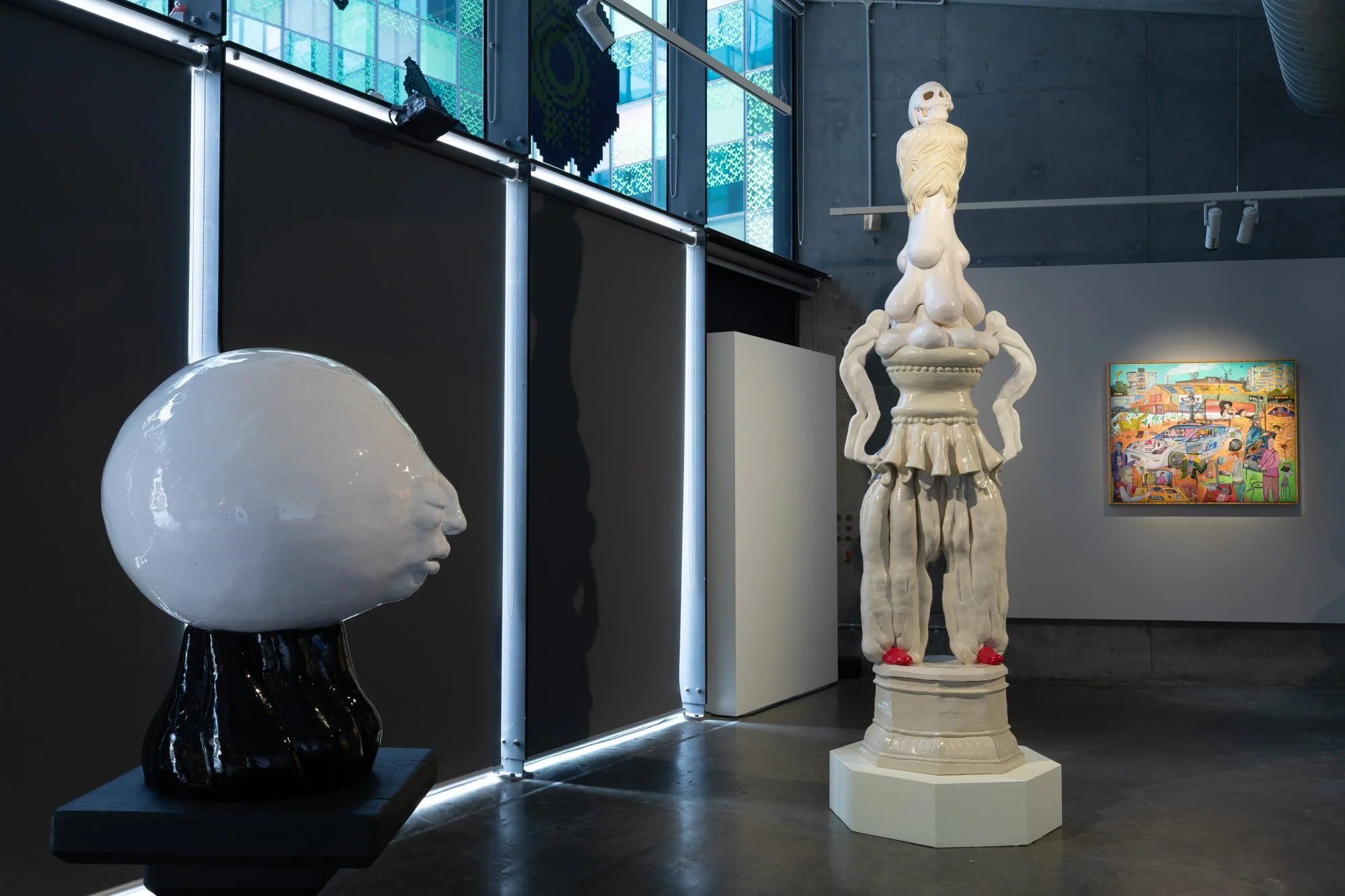 Left & centre: Cybele Cox, Moonfaces, 2019, Hand built glazed earthenware, 1300 x 1600 x 300mm; Red Shoes Vanitas, 2022, hand built ceramic, gesso, acrylic, epoxy, 2200 x 400 x 400mm.