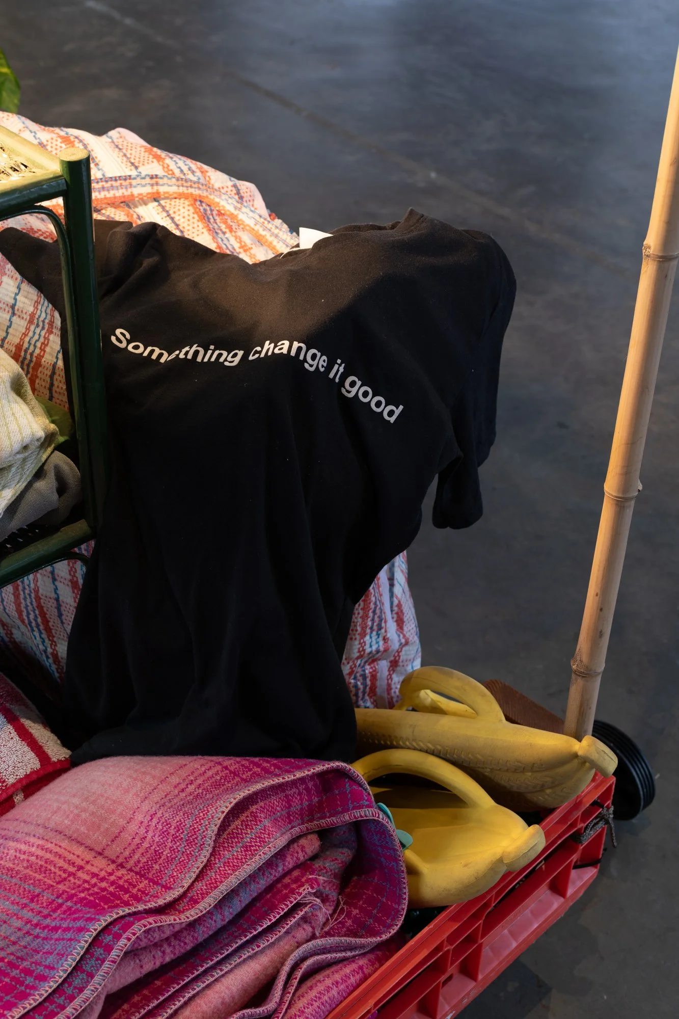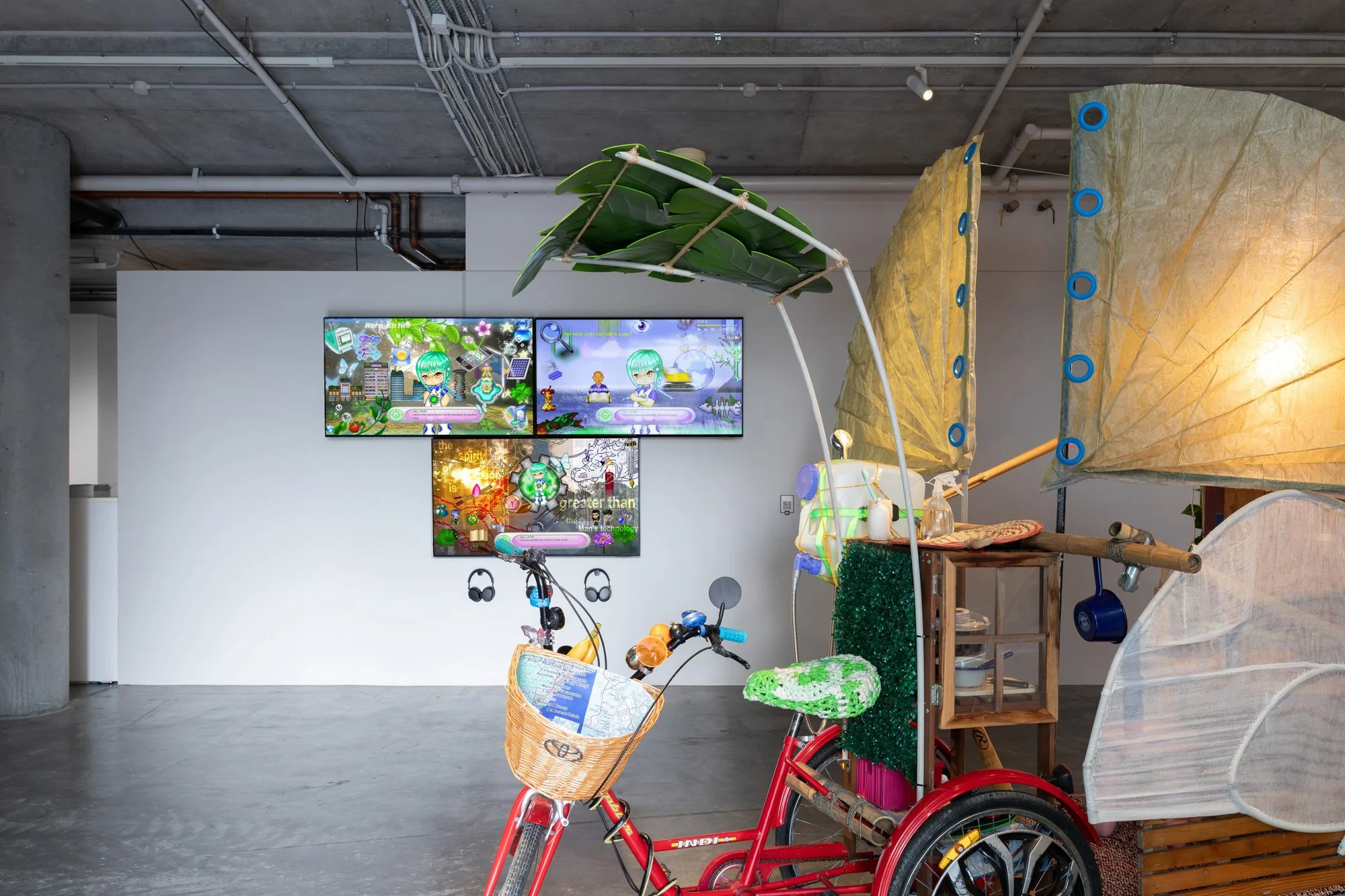 Madi Feist’s The Snail (2026) demonstrates a post-apocalyptic lifestyle grounded in self-reliance and scant resources. Countering Santoro’s depiction of overconsumption, the work is an off-grid mobile home composed of a tricycle and trailers, inhabited by an anonymous figure who could be either a snail or a snail enthusiast.