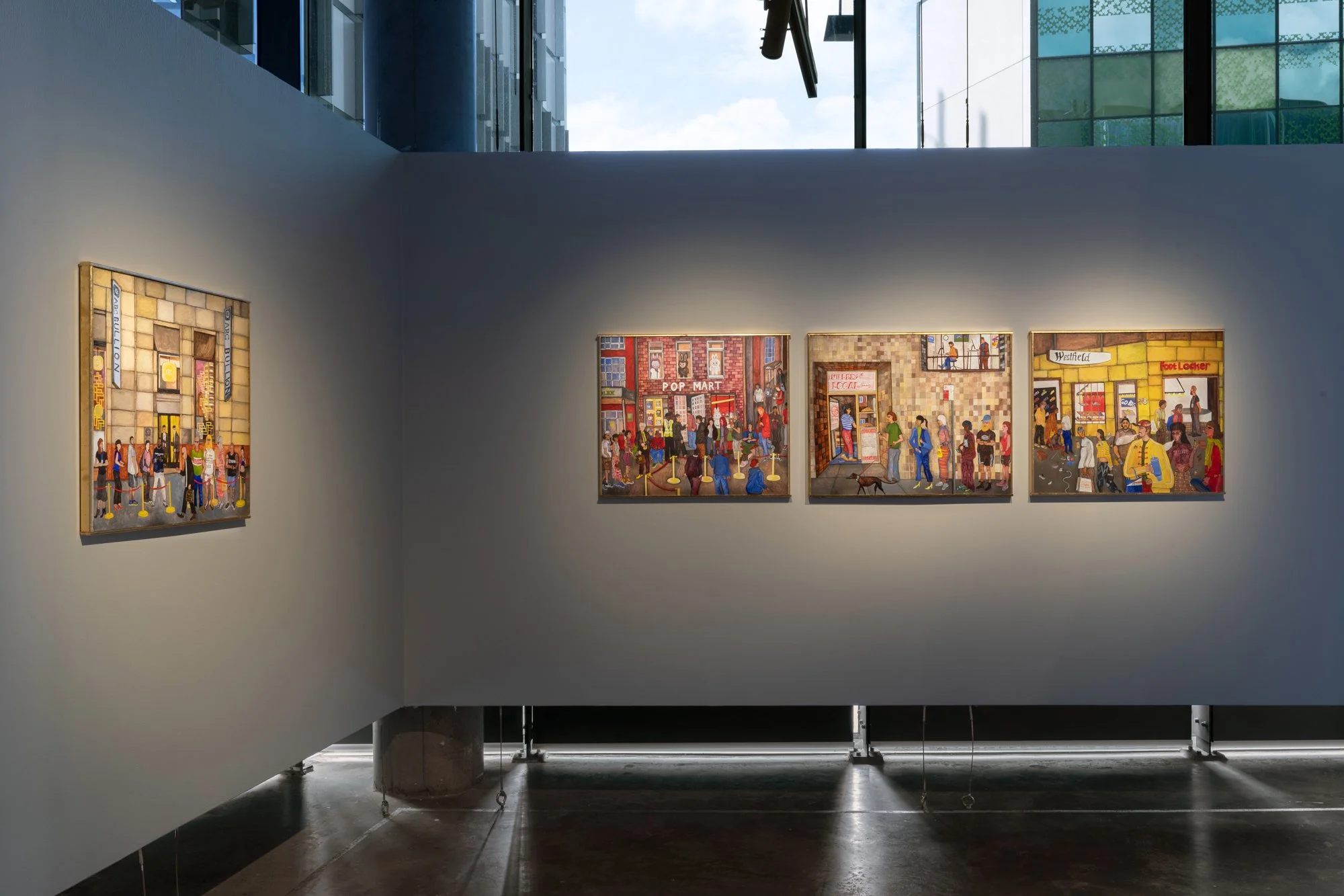 Nick Santoro’s Line Series presents four scenes of commerce that one might come across in the Sydney CBD. The series comprises four acrylic paintings titled The Bread Line (2025), The Sneaker Line (2026), The Gold Line (2026) and The Labubu Line (2026). Each depicts a conglomeration of branded humans and things, appearing ordered yet underlined by chaos, with figures eager to purchase luxury goods, safe-haven assets, and trendy commodities.