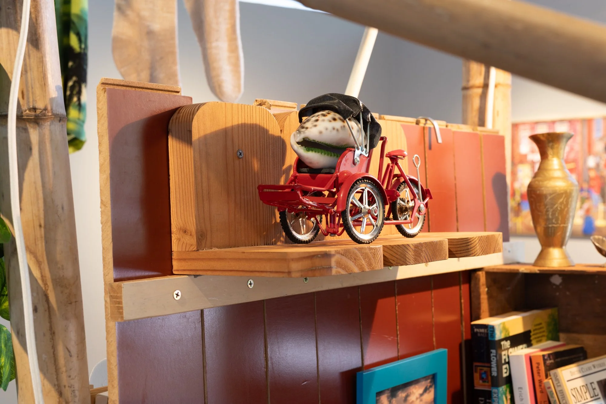 Madi Feist, The Snail (detail), 2026, INDI Rambler tricycle, found furniture and household objects, wood, metal hardware, bamboo, rachet straps, plants, pvc pipe, rope, assorted textiles, castor wheels, plastic, lamps, metal, shells, dimensions variable. Photography by Jessica Maurer.